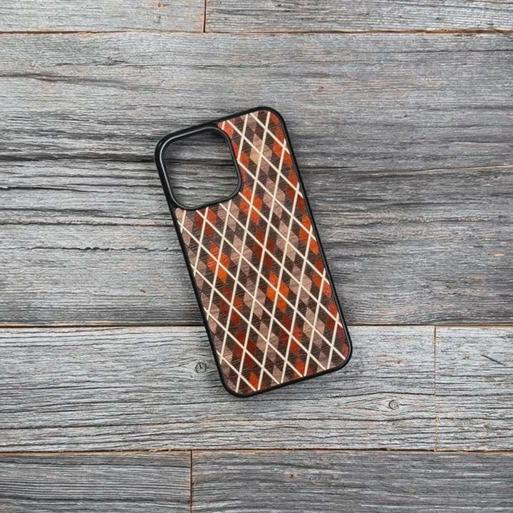Sophisticated, bold, and meticulously crafted. This Argyle-patterned wood phone case is for those who appreciate intricate design and exceptional detail. Featuring stunning geometric inlays of Walnut, Wenge, Maple, and Padauk, this piece delivers timeless elegance and everyday durability, ensuring you'll turn heads wherever you go.