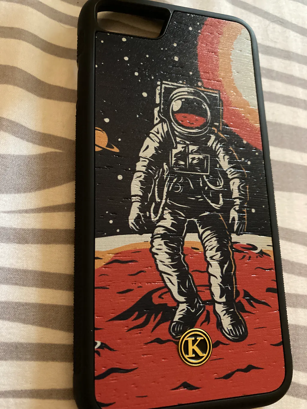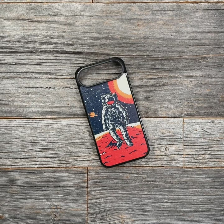 "That's one small step for man, one giant leap for mankind." The Cosmo was designed for space-lovers and those who dream as big and vast as the universe itself. This wood phone case features a stylized print of an astronaut's space-walk overtop the natural, warm grain of the Cherry backer.