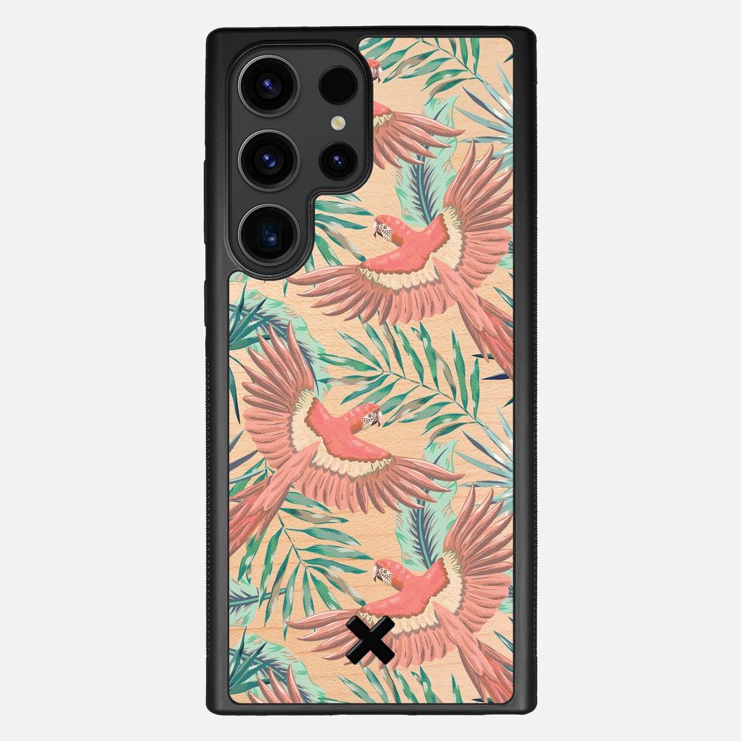 Bright and playful prints are fun all year round, not just on summer t-shirts! The Paradise speaks to the traveler in all of us, bringing a splash of vacation fashion to this wood phone case featuring a vibrant pattern of Macaws and tropical leaves printed on a Maple wood backer.