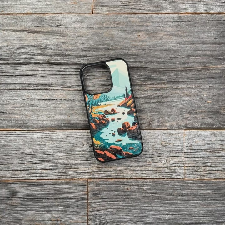 From grand National Parks to your local trails, nature is breathtaking, inspiring, and often hard to fully capture in photos and paintings. Part of series of canvas phone cases that aim to offer a splash of that outdoor beauty to those craving adventure in their busy every day schedule, the Sanctuary features a calm river flowing towards a lake at the base of the mountains.
