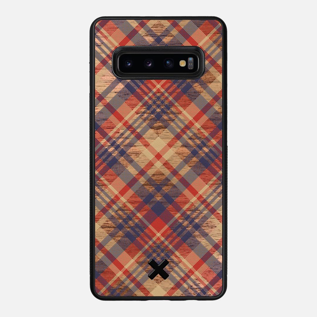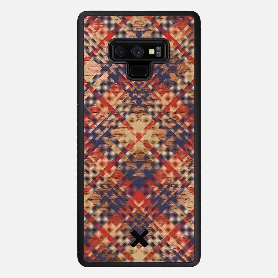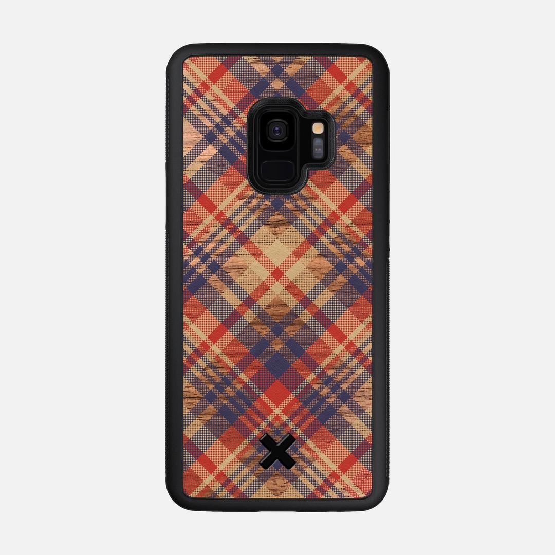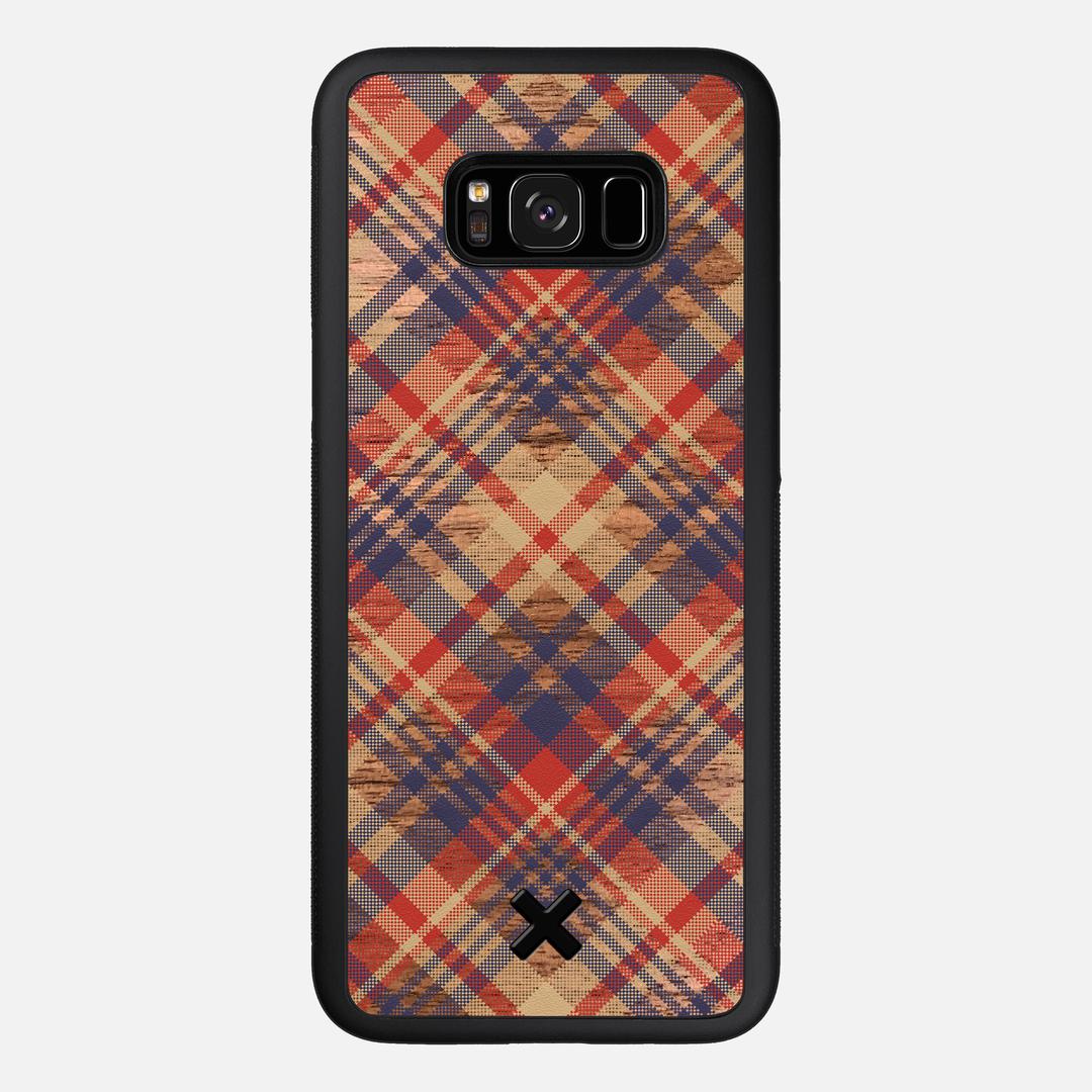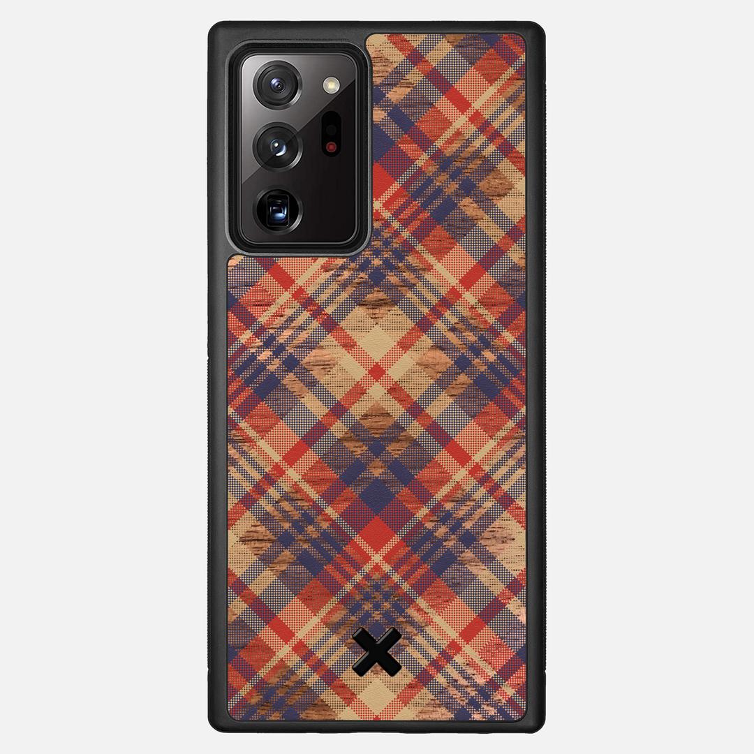 This premium wood phone case showcases the texture and grain of natural Walnut wood with a blue, beige, and red Tartan print.